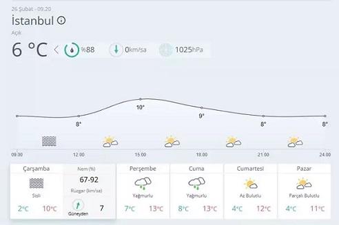 Meteoroloji Genel Müdürlüğü'nün güncel hava durumu tahmine göre İstanbul, güneşli havaya 2 günlük ara verecek. Yapılan tahminlere göre Perşembe ve Cuma günleri kentte sağanak yağış etkili olacak. Hafta sonu ise havanın güneşli ve 11-12 derece seviyelerinde olması bekleniyor.