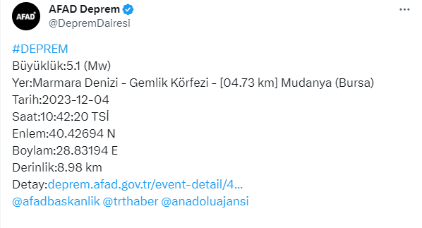 Afet ve Acil Durum Yönetimi Başkanlığı (AFAD) verilerine göre Gemlik körfezinde 10.42'de 5,1 büyüklüğünden bir deprem meydana geldi. Deprem 8,98 kilometre derinlikte oldu. Gemlik'te 3 dakika sonra 4,5 büyüklüğünde bir deprem daha meydana geldi.
