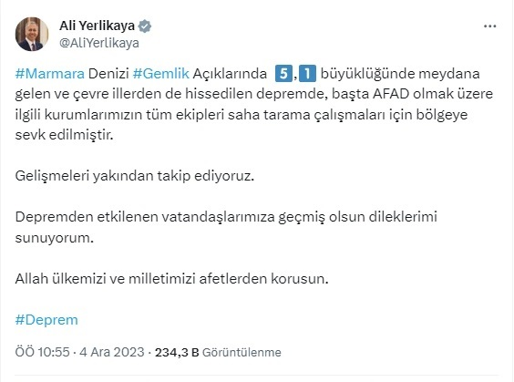 İçişleri Bakanı Ali Yerlikaya, ekip sahada tarama çalışması yaptığını açıkladı. Yerlikaya X hesabından yaptığı paylaşımda, "#Marmara Denizi #Gemlik Açıklarında , 5,1 büyüklüğünde meydana gelen ve çevre illerden de hissedilen depremde, başta AFAD olmak üzere ilgili kurumlarımızın tüm ekipleri saha tarama çalışmaları için bölgeye sevk edilmiştir. Gelişmeleri yakından takip ediyoruz. Depremden etkilenen vatandaşlarımıza geçmiş olsun dileklerimi sunuyorum" ifadelerini kullandı.