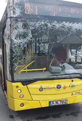 İstanbul Bakırköy'de alt geçide çarpan TIR, Halkalı Eminönü seferini yapan İETT otobüsünün üzerine devrildi. Otobüs son anda TIR'ın altında kalmaktan kurtuldu.