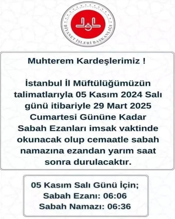 İstanbul İl Müftülüğü, sabah namazı vakitlerinde önemli bir değişiklik yaptığını duyurdu. Açıklamaya göre, 5 Kasım 2024 Salı gününden 29 Mart 2025 Cumartesi gününe kadar sabah ezanı imsak vaktiyle birlikte okunacak.