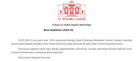 İstanbul Valiliğinin açıklaması şöyle:"03.05.2024 Cuma günü saat 10.30 sıralarında Beyoğlu İlçesi Örnektepe Mahallesi İmrahor Caddesi üzerinde devam eden Beyoğlu Beyoğlu İmam Hatip Ortaokulu inşaat alanında 30 adet askeri mühimmat bulunmuştur. Korozyona uğrayan havan topu olduğu değerlendirilen mühimmat, savcılık talimatıyla bertaraf edilmek üzere emniyet birimlerimizce muhafaza altına alınmıştır."