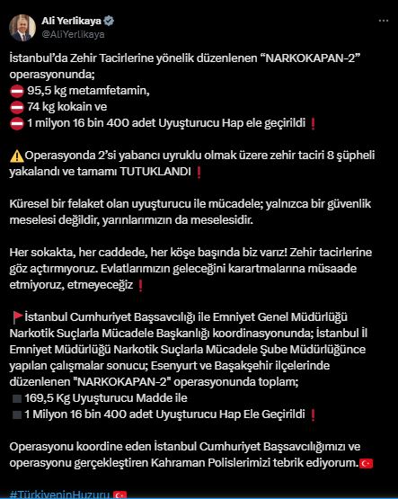 Yerlikaya, yaptığı açıklamada, İstanbul'un Esenyurt ve Başakşehir ilçelerinde uyuşturucu satıcılarına yönelik "NARKOKAPAN-2" operasyonunun düzenlendiğini belirtti.