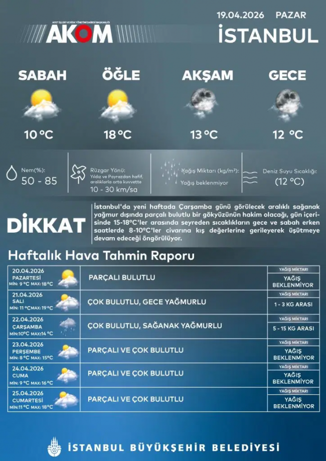 AKOM’un paylaştığı hava tahminine göre ise salı gecesi başlayacak yağışların çarşamba günü sağanağa dönüşeceği bildirildi. Yağış miktarının çarşamba günü artmasıyla birlikte sıcaklığın 14 dereceye kadar düşmesi bekleniyor.