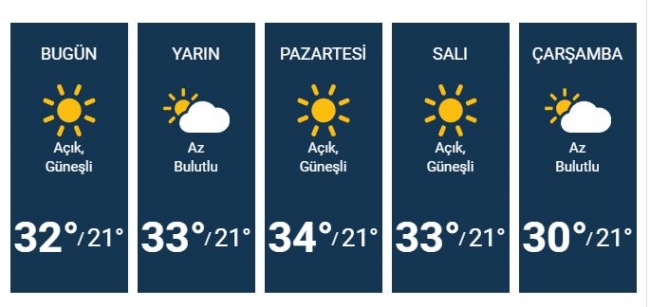 Meteoroloji Genel Müdürlüğü'nden alınan bilgilere göre İstanbul için 5 günlük hava durumu tahmini: Bugün için İstanbul hava durumu Açık, Güneşli, sıcaklık 32°. Yarın için İstanbul hava durumu Az Bulutlu, sıcaklık 33°.