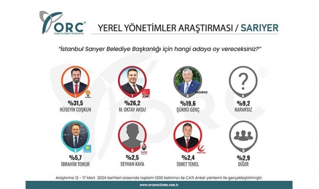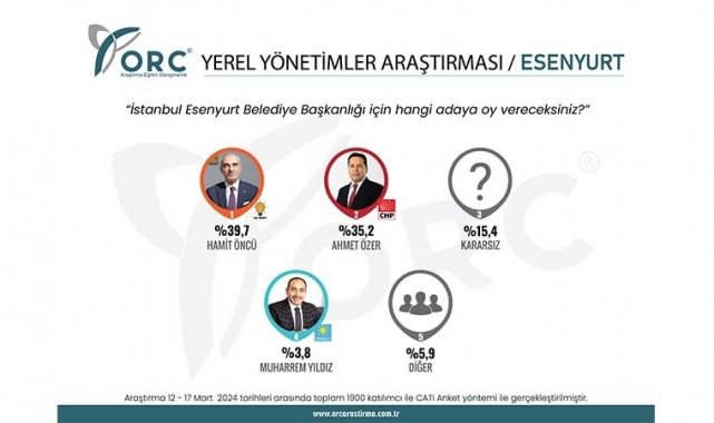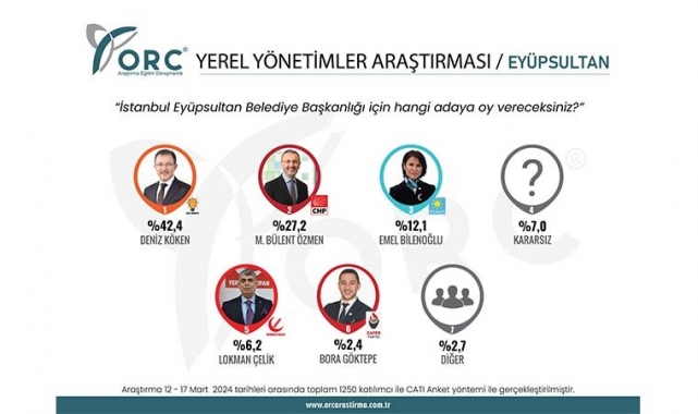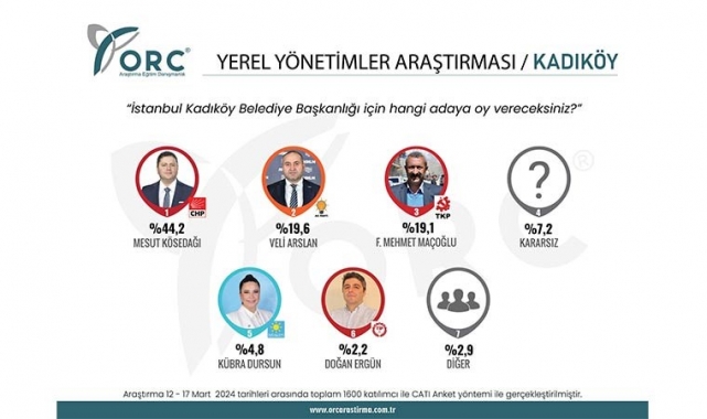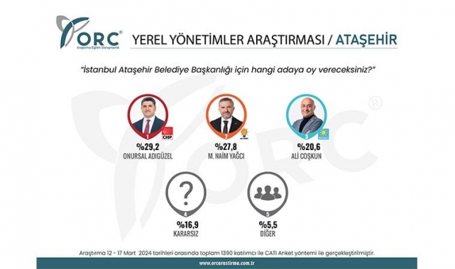 31 Mart'ta yapılması planlanan yerel seçim için geri sayım devam ederken; kamuoyu şirketlerinin paylaştığı anket sonuçları da yakından takip edilmeye devam ediyor.Son olarak ORC Araştırma İstanbul'un Kadıköy, Ataşehir, Sarıyer, Esenyurt ve Eyüpsultan ilçelerinde gerçekleştirdiği anket sonuçlarını paylaştı.Ankette özellikle Kadıköy ve Ataşehir'deki oy oranları dikkat çekti.
