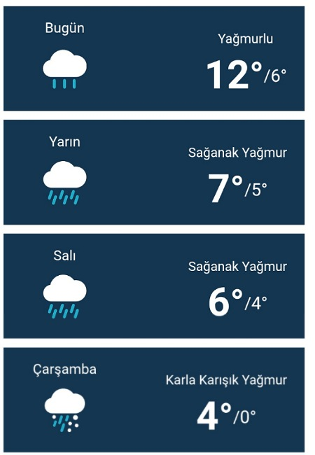 • “Salı günü de kuvvetli yağışların; 19.02.2025 (Çarşamba) günü karla karışık yağmur, yüksek kesimlerde ise kar yağışı olacağı tahmin edilmektedir. 20.02.2025 (Perşembe) ve 21.02.2025 (Cuma) günlerinde aralıklı olarak kar yağışlı geçeceği öngörülmektedir.”
