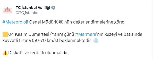 Valiliğin sosyal medya hesabından yapılan açıklamada, Meteoroloji Genel Müdürlüğünün değerlendirmelerine göre, bu gece saatlerinde İstanbul'da yerel olarak gök gürültülü sağanak beklendiği belirtildi.