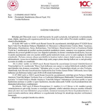 "Havai fişek atma belgesi olan kişilere, uygun alanlar için izin veriliyor. Sadece, 20.00-22.00 saatleri arasında havai fişek atılmasına izin verilebiliyor. Kurallara uymayanlara 232 bin 264 lira cezai işlem uygulanmaktadır."
