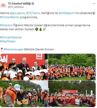 Tarım ve Orman Bakanlığı tarafından başlatılan Orman Benim kampanyası çerçevesinde İstanbul'da bir etkinlik düzenlendi. İstanbul Valisi Davut Gül, İstanbul Orman Bölge Müdürü Celal Pir, Eyüpsultan Kaymakamı İhsan Kara ve Eyüpsultan Belediyesi Başkanı Mithat Bülent Özmen'de katıldı.
