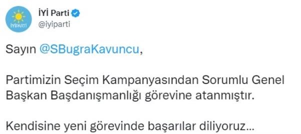 Partinin sosyal medya hesabında yapılan paylaşıma göre, İYİ Parti Genel Başkanı Meral Akşener, Buğra Kavuncu'ya yeni görevinde başarılar diledi. Açıklamada şu ifadelere yer verildi: "Sayın Buğra Kavuncu Partimizin Seçim Kampanyasından Sorumlu Genel Başkan Başdanışmanlığı görevine atanmıştır. Kendisine yeni görevinde başarılar diliyoruz…"