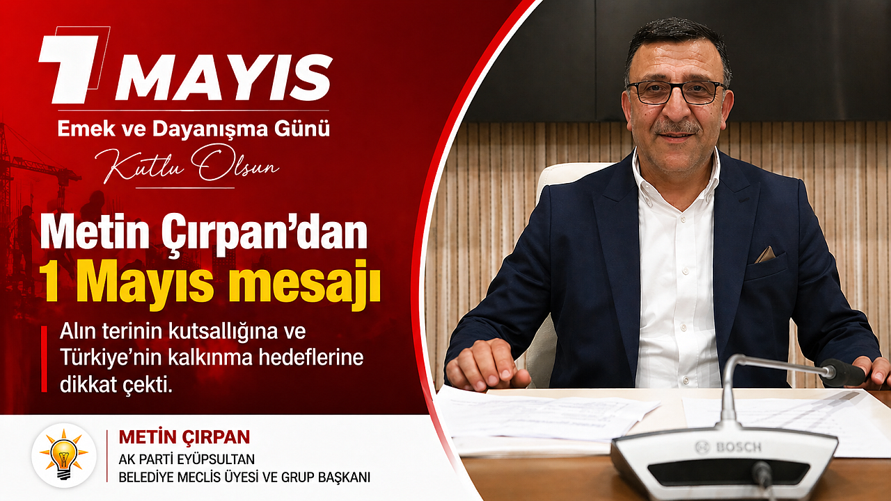 İSTANBUL / EYÜPSULTAN – AK Parti Eyüpsultan Belediye Meclis Üyesi ve Grup Başkanı Metin Çırpan, 1 Mayıs İşçi Bayramı dolayısıyla bir mesaj yayımladı. Çırpan, mesajında alın terinin kutsallığına ve Türkiye’nin kalkınma hedeflerine dikkat çekti.