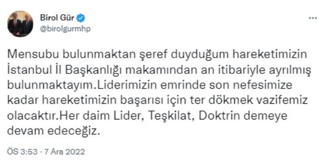 MHP İstanbul İl Başkanı Birol Gür, görevinden istifa ettiğini sosyal medya hesabından duyurdu.