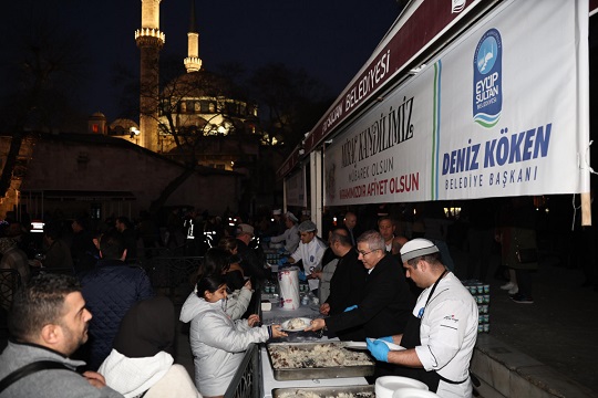 Mevlid sonrası Eyüpsultan Belediye Başkanı Deniz Köken, Eyüp Sultan Meydanı’nda vatandaşlara pilav ve ayran ikram etti.