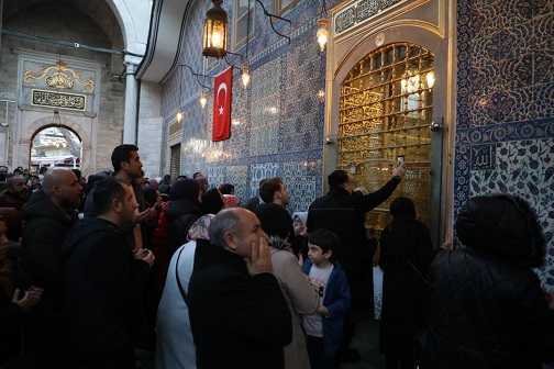 Miraç Kandili’ni Eyüpsultan’ın manevi atmosferinde idrak etmek isteyen müminler, Eyüp Sultan Camii’nde namazlarını kıldıktan sonra Eyüp Sultan Hazretleri’nin türbesini ziyaret etti.