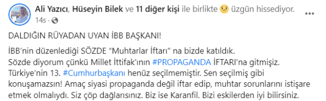 Türkiye’nin 13. Cumhurbaşkanı henüz seçilmemiştir. Sen seçilmiş gibi konuşamazsın! Amaç siyasi propaganda değil iftar edip, muhtar sorunlarını istişare etmek olmalıydı. Siz çöp dağlarısınız. Biz ise Karanfil. Bizi eskilerden iyi bilirsiniz.” ifadelerini kullandı.