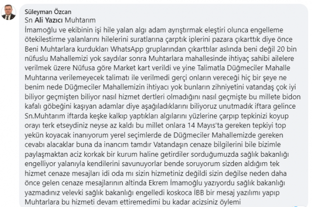 Tepkilerin hedefindeki İmamoğlu'na en sert eleştirilerden biriside Düğmeciler Mahallesi Muhtarı Süleyman Özcan'dan geldi. Özcan, 'İmamoğlu ve ekibinin mahalleyi ayrıştırdığını belirterek, İmamoğlu ve ekibinin işi hile yalan algı adam ayrıştırmak eleştiri olunca engelleme ötekilestirme yalanlarını hilelerini suratlarına çarptık iplerini pazara çıkarttık diye önce Beni Muhtarlara kurdukları WhatsApp gruplarından çıkarttılar aslında beni değil 20 bin nüfuslu Mahallemizi yok saydılar sonra Muhtarlara mahallesinde ihtiyaç sahibi ailelere verilmek üzere Nüfusa göre Market kart verildi ve yine Talimatla Düğmeciler Mahalle Muhtarına verilemeyecek talimatı ile verilmedi gerçi onların vereceği hiç bir şeye ne benim nede Düğmeciler Mahallemizin ihtiyacı yok bunların zihniyetini vatandaş çok iyi biliyor geçmişten biliyor nasıl hizmet dertleri olmadığını nasıl geçmişte bu millete bidon kafalı göbeğini kaşıyan adamlar diye aşağıladıklarını biliyoruz unutmadık iftara gelince Sn.Muhtarım iftarda keşke kalkıp yaptıkları algılarını yüzlerine çarpıp tepkinizi koyup orayı terk etseydiniz neyse az kaldı bu millet onlara 14 Mayıs'ta gereken tepkiyi top yekün koyacak inanıyorum yerel seçimlerde de Düğmeciler Mahallemizde gereken cevabı alacaklar buna da inancım tamdır Vatandaşın cenaze bilgilerini bile bizimle paylaşmaktan aciz korkak bir kurum haline getirdiler sorduğumuzda sağlık bakanlığı engelliyor yalanıyla kendilerini savunuyorlar bende soruyorum sizden aldığım tek hizmet cenaze mesajları idi oda mı sizin hizmetiniz değildi sizin değilse neden daha önce gelen cenaze mesajlarının altinda Ekrem İmamoğlu yazıyordu sağlık bakanlığı yazmadınız velevki sağlık bakanlığı engelledi koskoca İBB bir mesaj yazılımı yapıp Muhtarlara bu hizmeti devam ettiremedimi bu kadar acizsiniz öylemi..' ifadelerini kullandı.