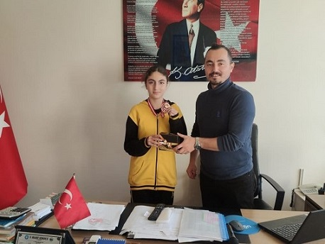 Katıldıkları yarışmalarda Madalya alan Şehit Murat Karakuş Ortaokulu öğrencileri Esmanur Ersoy ve Nisa Nur Aktaş’a Müdür Ahmet Bodur madalyalarını takdim ederek başarılarının devamını diledi.
