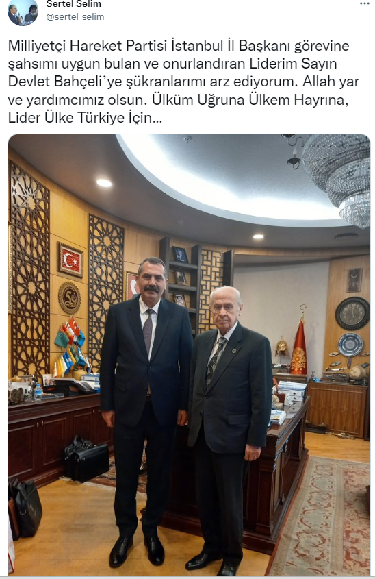 Milliyetçi Hareket Partisi İstanbul İl Başkanlığı görevnden istifa eden Birol Gür'in yerine genel merkez tarafından sertel selim atandı.Selim sosyal medya hesabından MHP İstanbul İl Başkanlığı görevine getirildiğini duyurdu.Selim paylaşımında şu ifadeleri kullandı."Milliyetçi Hareket Partisi İstanbul İl Başkanı görevine şahsımı uygun bulan ve onurlandıran Liderim Sayın Devlet Bahçeli’ye şükranlarımı arz ediyorum. Allah yar ve yardımcımız olsun. Ülküm Uğruna Ülkem Hayrına, Lider Ülke Türkiye İçin…"