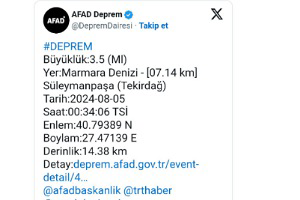 Afet ve Acil Durum Yönetimi Başkanlığı Marmara Denizi'nde 3.5 büyüklüğünde bir Deprem meydana geldiğini duyurdu.