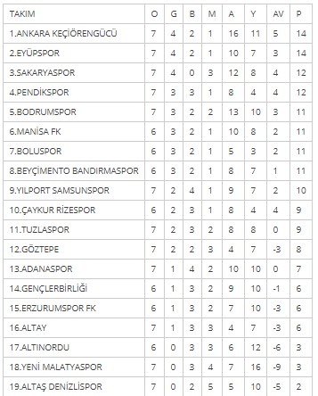 Spor Toto 1. Lig'de 7. hafta maçlarının ardından oluşan puan durumu şöyle: