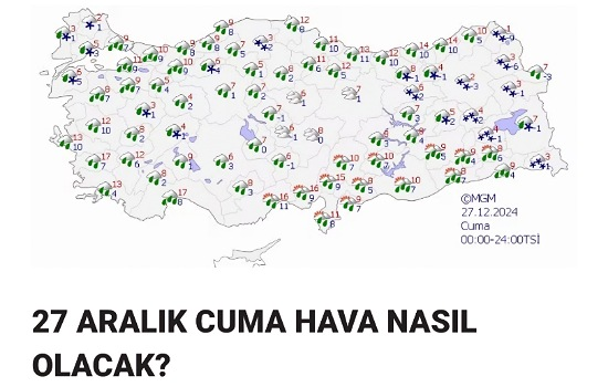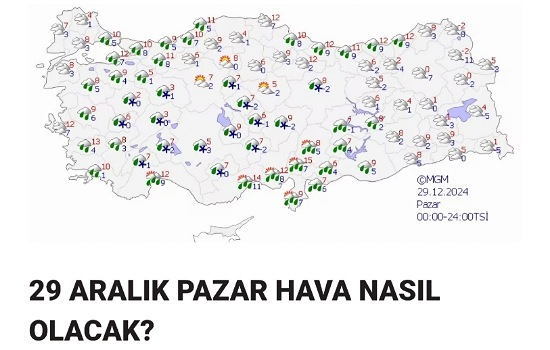 KUVVETLİ YAĞIŞ UYARISI: Yağışların, Doğu Anadolu’nun güneydoğusu, Güneydoğu Anadolu’nun doğusu, İstanbul, Kırklareli, Kocaeli, Sakarya, Yalova, Bursa, Antalya, Bingöl ve Şanlıurfa çevrelerinde yer yer kuvvetli olması beklendiğinden, ulaşımda aksamalar, sel, su baskını, heyelan, yükseklerde buzlanma, don ve tipi gibi olumsuzluklara karşı dikkatli ve tedbirli olunmalıdır.