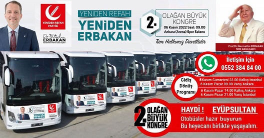 Yeniden Refah Partisi 2. Olağan Büyük Kongresi yaklaştıkça partinin sahadaki çalışmaları da artarak devam ediyor. Yeniden Refah Partisi Eyüpsultan İlçesi Büyük Kongreye 13 otobüs ile katılmayı planlıyor.