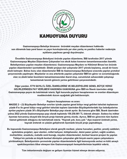 Yerel basında çıkan konuya istinaden Gaziosmanpaşa Belediyesi'nin kamuoyuna yaptığı açıklama;